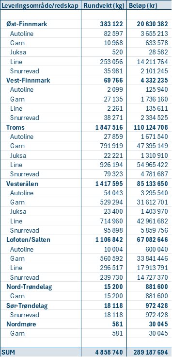 Verdimessig nådde vi i 2024 opp i 235 millioner kroner samlet for de to sesongene, av et kvantum på 5.562 tonn omsatt gjennom Norges Råfisklag. Tilsvarende fra omsetningen i 2023 var 7.500 tonn og 326 millioner kroner.