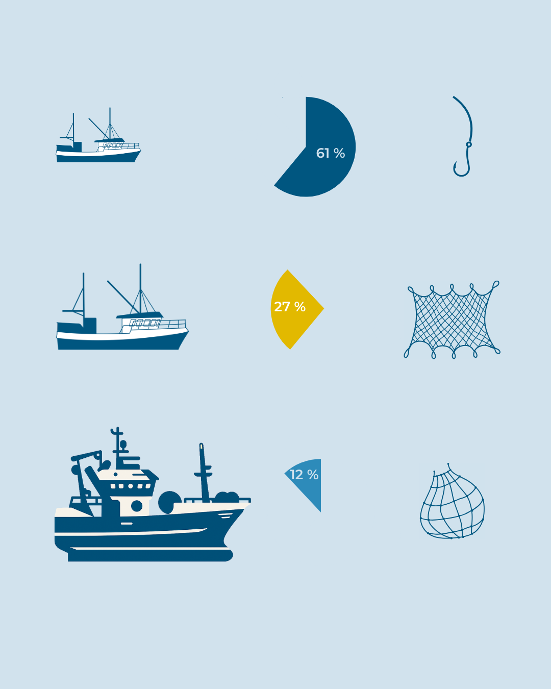 Over 60 % av totalkvantumet ble levert av båter under 14 meter, og nesten halvparten av all blåkveite ble fanget med redskap line. I fjor ble mesteparten fanget med redskap garn.