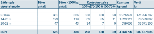 Antallet båter som har levert blåkveite i perioden er noe høyere enn de to foregående årene, 488 med kvanta over 1.000 kg mot 447 i 2024 og 443 i 2023. Dette kan ha sammenheng med fiskets varighet i år, som i større grad involverer fartøy som har fisket blåkveite som bifangst. Det er først og fremst i båtstørrelsen 0-14 meter deltakelsen har økt, opp fra 284 i fjor til 326 i år. I de to andre størrelsesgruppene er det liten endring. Når det gjelder kvoteutnyttelse er det en klar tendens at en større andel av deltakende båter har nådd eller nærmer seg kvotetaket. Det er også mange som har fisket over kvoten, for de fleste innebærer det et bifangstfiske etter at fartøyets maksimalkvote er fisket.