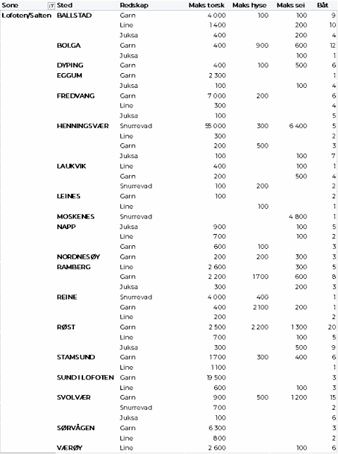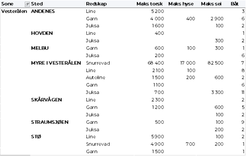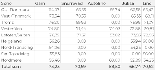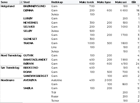 Tabell 2 og 3 viser fordelingen av landingene av fersk torsk per leveringssone og redskap (unntatt trål), med tilhørende snittpriser. De to tabellene er basert på omsetning av kvalitet A og ekstra, der alle leveringstilstander inngår, men der snittprisene er omregnet til sløyd uten hode-priser, eksklusiv restråstoff.