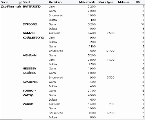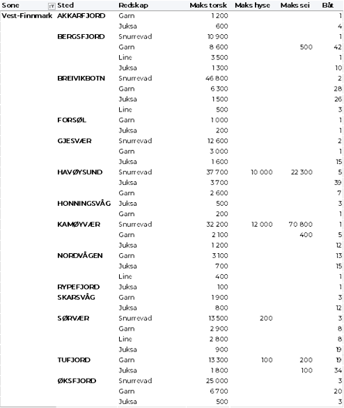 Kvanta fordelt per leveringssone fremgår av tabell 2. Sammenlignet med uke 14 var det reduksjon i landingene over hele linja. Størst kvantum var fremdeles levert i Vest-Finnmark med 1.510 tonn, som var ned fra 1.700 tonn uka før.