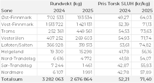 Omsetningen av fersk torsk utgjorde 2.700 tonn til verdi 130 millioner kroner. En reduksjon fra 4.890 tonn/241 millioner kroner uken før. Av totalkvantumet stod garn for 1.390 tonn etterfulgt av snurrevad med 880 tonn, juksa med 290 tonn og line/autoline med 160 tonn. For garn var 760 tonn omsatt til kjøpere i Vest-Finnmark, 240 tonn i Troms, 200 tonn i Lofoten/Salten, 120 tonn i Øst-Finnmark, 25 tonn i Vesterålen og 20 tonn i området Helgeland-Nordmøre. Av snurrevadkvantumet gikk 440 tonn til kjøpere i Vest-Finnmark, 190 tonn i Vesterålen, 160 tonn i Troms, 60 tonn i Lofoten og 20 tonn i Øst-Finnmark. Det meste av juksakvantumet var levert i Vest-Finnmark, mens linekvantumet var spredt med en topp i Lofoten og Vesterålen med 40 tonn på hver.