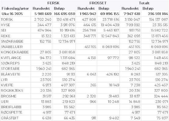 Omsetningen av ferskt råstoff i uke 16 utgjorde 167 millioner kroner, ned fra 287 millioner kroner uka før. Torsken var størst i verdi, fulgt av snøkrabbe, sei, hyse og kongekrabbe til verdi henholdsvis 130, 13, 10, 4 og 3 millioner kroner, og for øvrig slik det framgår av tabell 1.
