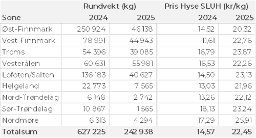 Kvantumet fersklevert hyse i uke 16 var 240 tonn til verdi 4 millioner kroner. Det var ned fra 650 tonn/11 millioner kroner uken før. Tabell 5 viser sonevis fordeling av kvanta, spredt aktivitet.