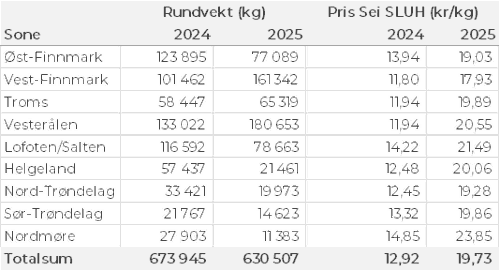Omsetningen av fersk sei i uke 17 utgjorde 630 tonn til verdi 9 millioner kroner, som var ned fra 670 tonn og 10 millioner kroner i uke 16. Kvanta fersk sei fordelt per leveringssone fremgår av tabell 4. Størst aktivitet i Vesterålen og Vest-Finnmark med henholdsvis 180 og 160 tonn. Deretter fulgte Lofoten/Salten, Øst-Finnmark og Troms med 60-80 tonn på hver, og 70 tonn var levert i området Helgeland-Nordmøre. Av de 280 tonnene levert Vest-Finnmark var 270 tonn tatt på snurrevad. Av totalen på 630 tonn var 420 tonn tatt på snurrevad, i hovedsak levert i Vest-Finnmark og Vesterålen, og 160 tonn på et mer spredt garnfiske.