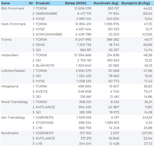 Omsetningen av fersk torsk utgjorde 1.950 tonn til verdi 93 millioner kroner. En reduksjon fra 2.700 tonn/130 millioner kroner uken før. Av totalkvantumet stod garn for 780 tonn etterfulgt av snurrevad med 750 tonn, juksa med 230 tonn og line/autoline med 190 tonn. For garn var 440 tonn omsatt til kjøpere i Vest-Finnmark, 100 tonn i Troms, 75-80 tonn i Lofoten/Salten og tilsvarende i Vesterålen, 50 tonn i Øst-Finnmark, og 30 tonn i området Helgeland-Nordmøre. Av snurrevadkvantumet gikk 460 tonn til kjøpere i Vest-Finnmark, 130 tonn i Øst-Finnmark, 90 tonn i Vesterålen, 50 tonn i Troms og 20 tonn i Lofoten. Det meste av juksakvantumet var levert i Vest-Finnmark, mens linekvantumet var spredt med en topp i Øst-Finnmark med 70 tonn.