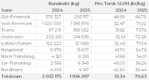 Råfisklagets omsetning hittil i år, per 27. april 2025, er 9.535 millioner kroner. Det er fordelt med 7.899 millioner kroner for norske båter, og 1.636 millioner kroner for utenlandske. Tilsvarende for fjoråret var 8.160 millioner kroner totalt, hvorav 7.054 var etter landinger fra norske båter og 1.106 for utenlandske båter.