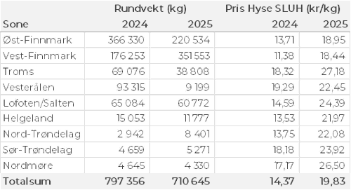 Kvantumet fersklevert hyse i uke 17 var 710 tonn til verdi 10 millioner kroner. Det var opp fra 240 tonn/4 millioner kroner uken før. Tabell 5 viser sonevis fordeling av kvanta. Finnmark topper med totalt 570 tonn, fordelt med 350 tonn i Vest- og 220 tonn i Øst-Finnmark.