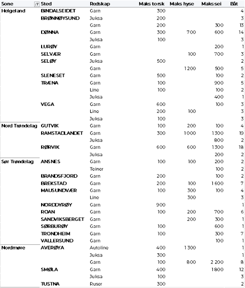 Tabell 2 og 3 viser fordelingen av landingene av fersk torsk per leveringssone og redskap (unntatt trål), med tilhørende snittpriser. De to tabellene er basert på omsetning av kvalitet A og ekstra, der alle leveringstilstander inngår, men der snittprisene er omregnet til sløyd uten hode-priser, eksklusiv restråstoff.