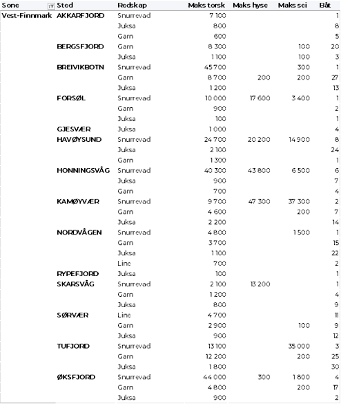 Kvanta fordelt per leveringssone fremgår av tabell 2. Sammenlignet med uke 16 var det reduksjon i landingene over hele linja. Størst kvantum var fremdeles levert i Vest-Finnmark med 1.110 tonn, som var ned fra 1.510 tonn uka før.