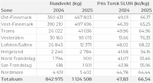 Kvanta fordelt per leveringssone fremgår av tabell 2. Det var bare Øst-Finnmark som holdt samme nivå som uka før, ellers var det reduksjon for øvrige områder. Størst kvantum var fremdeles levert i Vest-Finnmark med vel 500 tonn, som var ned fra 600 tonn uka før.