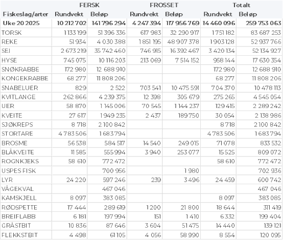 Omsetningen av ferskt råstoff i uke 20 utgjorde 142 millioner kroner, ned fra 164 millioner kroner uka før. Torsken var størst i verdi, fulgt av sei, snøkrabbe, kongekrabbe, hyse, kvitlange og reke til verdi henholdsvis 51, 36, 13, 12, 10, 4 og 4 millioner kroner, og for øvrig slik det framgår av tabell 1.