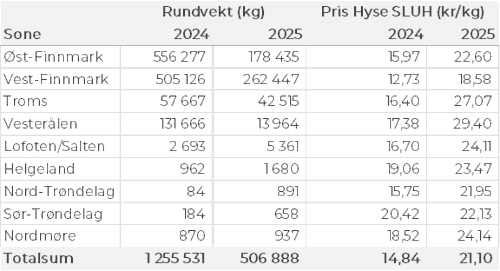 Kvantumet fersklevert hyse i uke 21 var 510 tonn til verdi 8 millioner kroner. Det var ned fra 750 tonn/10 millioner kroner uken før. Tabell 5 viser sonevis fordeling av kvanta. Finnmark topper med totalt 440 tonn, fordelt med 260 tonn i Vest- og 180 tonn i Øst-Finnmark. 360 tonn av totalen var tatt på snurrevad, 130 tonn på line/autoline.