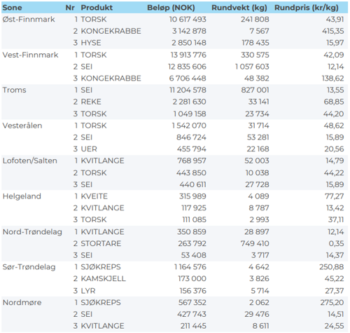 Kvanta fordelt per leveringssone fremgår av tabell 2. Størst kvantum var fremdeles levert i Vest-Finnmark med 330 tonn, som var ned fra 500 tonn uka før.