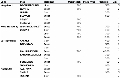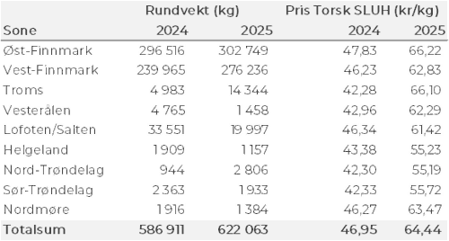 Tabell 2 og 3 viser fordelingen av landingene av fersk torsk per leveringssone og redskap (unntatt trål), med tilhørende snittpriser. De to tabellene er basert på omsetning av kvalitet A og ekstra, der alle leveringstilstander inngår, men der snittprisene er omregnet til sløyd uten hode-priser, eksklusiv restråstoff.
