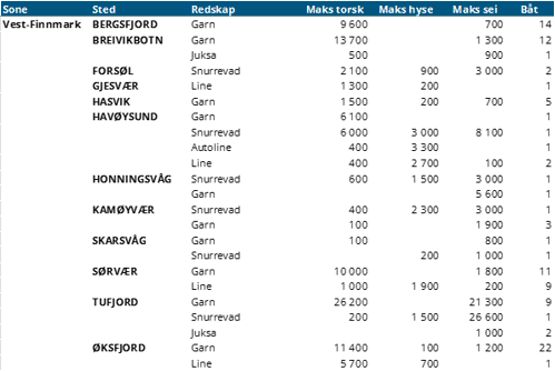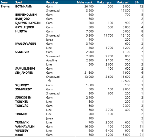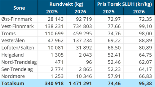 Hittil i år står garnfisket for 1.984 tonn av all fersk torsk, sammenlignet med samme periode i fjor som var på 902 tonn. Samtidig er mengden fra trål redusert fra 532 tonn til 304 tonn for de tre første ukene i 2025 sammenlignet med 2026. For samme periode er det økte landinger i Vest-Finnmark hvor det meste av garnfisket foregår, sammenlignet med fjoråret, med totalt 1.335 tonn i 2026 mot 600 tonn i 2025. Også Troms har en økning i kvantum for de tre første ukene av året, med totalt 723 tonn sammenlignet med 527 tonn for de tre første ukene av fjoråret. Mindre kvantum av fersk torsk i Øst-Finnmark og Lofoten/Salten sammenlignet med fjoråret, der reduserte landinger av fersk torsk fra trål og line for Øst-Finnmark, og fersk torsk fra snurrevad gjør størst utslag.