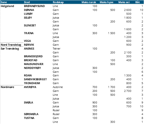 Tabell 2 og 3 viser fordelingen av landingene av fersk torsk per leveringssone og redskap (unntatt trål), med tilhørende snittpriser. De to tabellene er basert på omsetning av kvalitet A og ekstra, der alle leveringstilstander inngår, men der snittprisene er omregnet til sløyd uten hode-priser, eksklusivt restråstoff.