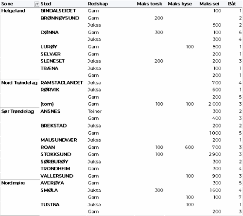 Tabell 2 og 3 viser fordelingen av landingene av fersk torsk per leveringssone og redskap (unntatt trål), med tilhørende snittpriser. De to tabellene er basert på omsetning av kvalitet A og ekstra, der alle leveringstilstander inngår, men der snittprisene er omregnet til sløyd uten hode-priser, eksklusivt restråstoff.