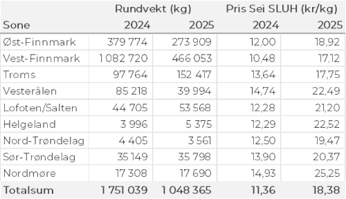 Omsetningen av fersk sei i uke 34 utgjorde 1.108 tonn til verdi 15 millioner kroner. En liten nedgang fra uken før når det var omsatt 1.181 tonn/ 16 millioner kroner. I likhet med torsken, er det mest aktivitet i Finnmark der 524 tonn er levert i Vest-Finnmark og 275 tonn i Øst-Finnmark. Deretter følger Troms med 160 tonn, 39 tonn i Vesterålen, 47 tonn i Lofoten og 34 tonn i Sør Trøndelag. Kvanta under 20 tonn per sone for resterende. Av totalen er 543 tonn tatt med not, 303 tonn med snurrevad, 164 tonn med garn og 58 tonn med trål. Kvanta under 21 tonn per redskap for resterende. For notfisket er det meste levert i Vest-Finnmark (410 tonn) og Troms (125 tonn). Notfangstene er levert 6 kjøpere av 9 båter. Notkvanta fordeler seg med 167 tonn Havøysund, 148 tonn Kamøyvær, 91 tonn Tufjord, 94 Årviksand og 32 tonn Skjervøy. Kvanta under 6 tonn for de to resterende.