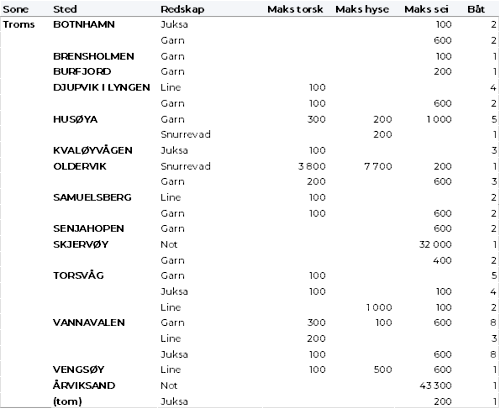 Tabell 2 og 3 viser fordelingen av landingene av fersk torsk per leveringssone og redskap (unntatt trål), med tilhørende snittpriser. De to tabellene er basert på omsetning av kvalitet A og ekstra, der alle leveringstilstander inngår, men der snittprisene er omregnet til sløyd uten hode-priser, eksklusivt restråstoff.