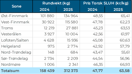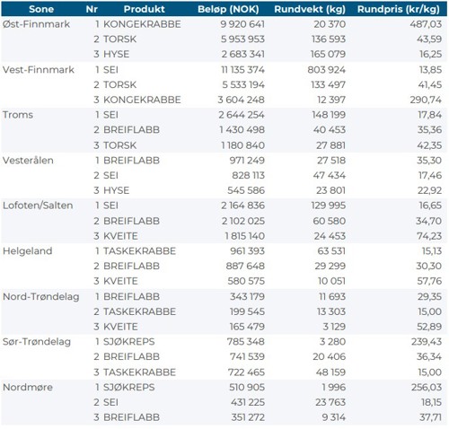 Hittil i år er det omsatt om lag 1.003 tonn til en verdi av 70,2 millioner kroner, mot 1.634 tonn og 98,8 millioner kroner i samme periode i fjor. Gjennomsnittsprisen for rund ligger dermed 9,4 kroner høyere enn på samme tid i fjor.