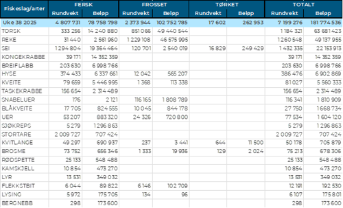 Omsetningen av ferskt råstoff i uke 38 utgjorde 79 millioner kroner, som var ned fra 83 millioner kroner uken før. Det meste av dette var det sei, kongekrabbe, torsk, breiflabb, hyse og kveite som stod for med henholdsvis 19, 14, 14, 7, 6 og 5 millioner kroner. Omsetning for disse og resterende arter fremkommer av tabell 1.