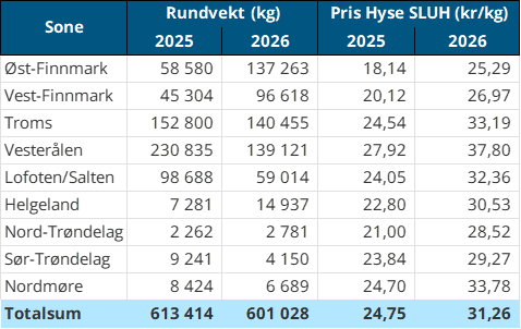 Kvantumet fersklevert hyse i uke 4 er 602 tonn til verdi 13,4 millioner kroner. En økning fra 424 tonn/ 9,7 millioner kroner uken før. Hittil i 2026 er det omsatt 1.430 tonn fersk hyse til 32,4 millioner kroner, dette er en reduksjon i kvantum fra samme periode i 2025, men en økning i verdi. For uke 4 er det størst aktivitet i Troms og Vesterålen med henholdsvis 141 og 139 tonn levert. For resterende soner er det omsatt 137 tonn i Øst-Finnmark, 97 tonn i Vest-Finnmark, 59 tonn i Lofoten/Salten og kvanta fra 15 tonn og lavere for resterende soner. For sonefordelte kvantum, beløp og priser for 2026 vs. 2025 YTD vises til tabell 5 under.
