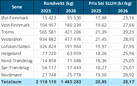 Omsetningen av fersk sei i uke 4 er 1.522 tonn til verdi 32 millioner kroner, opp fra forrige ukes 1.235 tonn / 26 millioner kroner. Hittil i år havner omsetningen av fersk sei på 4.576 tonn og 95,3 millioner kroner, mot 6.591 tonn og 101 millioner kroner samme periode i fjor.