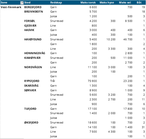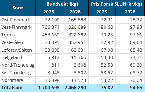 Hittil i år står garnfisket for 3.800 tonn av all fersk torsk, sammenliknet med samme periode i fjor som var på 2.171 tonn, hvor uke 4 i 2025 utgjorde 1.266 tonn av denne totalen. Mengden fra trål er redusert fra 114 tonn i uke 4 i 2025 til 76 tonn samme uke i 2026, samlet er det en reduksjon fra 645 tonn hittil i år i 2025 til 379 tonn hittil i år i 2026. Så langt i år er det landet 2.451 tonn fersk torsk i Vest-Finnmark, sammenlignet med samme periode i fjor som lå på 1.369 tonn, hvor garn står for nesten alt av fangsten. Troms ser en økning i samme periode fra 1.053 tonn til 1.547 tonn med en lik redskapsfordeling som Vest-Finnmark. Øst-Finnmark ser en nedgang fra 730 tonn til 632 tonn, mens Vesterålen ser en oppgang fra 576 tonn til 618 tonn, hvor garnfangsten har stått for mye av oppgangen sammenliknet med samme periode i fjor.
