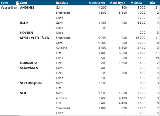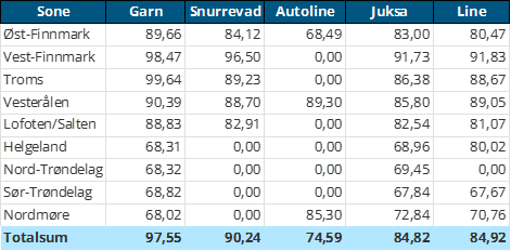 Tabell 2 og 3 viser fordelingen av landingene av fersk torsk per leveringssone og redskap (unntatt trål), med tilhørende snittpriser. De to tabellene er basert på omsetning av kvalitet A og ekstra, der alle leveringstilstander inngår, men der snittprisene er omregnet til sløyd uten hode-priser, eksklusivt restråstoff.