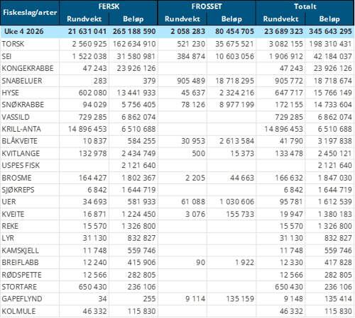 Hittil i år (per uke 4) er det omsatt for totalt 1.046 millioner kroner i Norges Råfisklag. Herav utgjør utenlandske landinger 30 millioner kroner. Norske fartøy står for resterende verdi på 1.016 millioner kroner, fordelt med 641 millioner på fersk og 375 millioner på fryst. Omsetningen til samme tid i fjor utgjorde 1.041 millioner kroner, herav 82 millioner kroner etter landing fra utenlandske fartøy. For norske båter var omsetningen 959 millioner kroner, fordelt med 479 på fersk og 480 på fryst råstoff. Omsetningen av fersklevert råstoff er dermed opp med 162 millioner kroner, mens for fryst er det en reduksjon på 105 millioner kroner.
