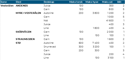 Tabell 2 og 3 viser fordelingen av landingene av fersk torsk per leveringssone og redskap (unntatt trål), med tilhørende snittpriser. De to tabellene er basert på omsetning av kvalitet A og ekstra, der alle leveringstilstander inngår, men der snittprisene er omregnet til sløyd uten hode-priser, eksklusivt restråstoff.