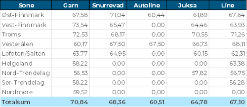 Hittil i år er det omsatt 2.154 tonn til en verdi av 32 millioner kroner, til samme tid i fjor var det omsatt 2.490 tonn til 34 millioner kroner.