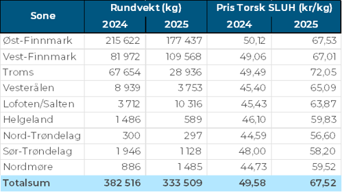 Hittil i år er det omsatt 1.207 tonn kveite til en verdi på 84 millioner kroner, mot 2.082 tonn / 127 millioner kroner i 2024 i samme periode. Gjennomsnittsprisen for rund kveite hittil i år ligger på 69,85 kr/kg, opp 9 kr/kg fra samme periode i fjor.
