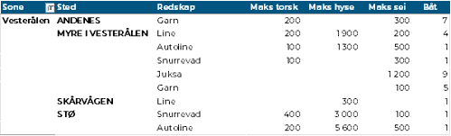 Tabell 2 og 3 viser fordelingen av landingene av fersk torsk per leveringssone og redskap (unntatt trål), med tilhørende snittpriser. De to tabellene er basert på omsetning av kvalitet A og ekstra, der alle leveringstilstander inngår, men der snittprisene er omregnet til sløyd uten hode-priser, eksklusivt restråstoff.