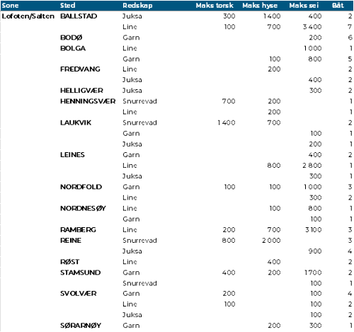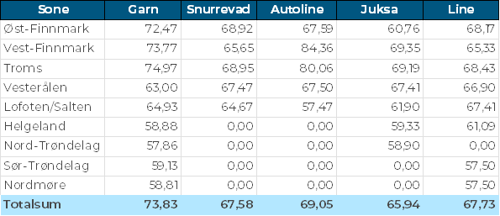 Tabell 2 og 3 viser fordelingen av landingene av fersk torsk per leveringssone og redskap (unntatt trål), med tilhørende snittpriser. De to tabellene er basert på omsetning av kvalitet A og ekstra, der alle leveringstilstander inngår, men der snittprisene er omregnet til sløyd uten hode-priser, eksklusivt restråstoff.