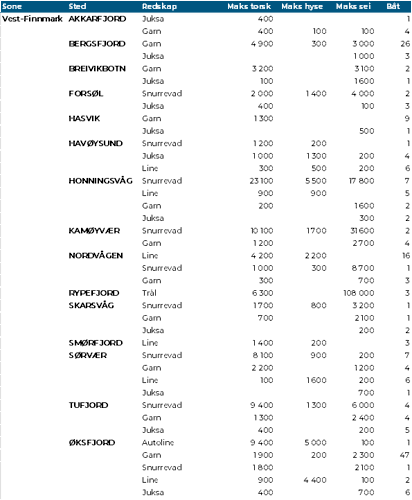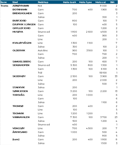 Omsetningen av fersk torsk i uke 45 kom på 1.100 tonn til en verdi av 52 millioner kroner, opp fra forrige ukes 790 tonn /37 millioner kroner. Av kvantumet i uke 45 var 390 tonn tatt på garn, 360 tonn på line/autoline, 320 tonn på snurrevad og mindre kvanta på juksa, trål og teiner. Det meste av linekvantumet, 300 tonn, var levert i Øst-Finnmark, mens garnkvantumet i hovedsak var levert i Vest-Finnmark (220 tonn) og Troms (150 tonn). Snurrevadkvantumet var i hovedsak levert i Øst-Finnmark med 175 tonn og Vest-Finnmark med 120 tonn. Av totalen ble 890 tonn levert i Finnmark, 490 tonn i Øst- og 400 tonn i Vest-Finnmark. 180 tonn var levert i Troms og ellers spredt. Økte landinger fra både garn, line og snurrevad, og geografisk var det størst øking i Øst-Finnmark.
