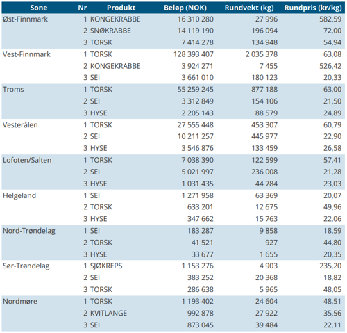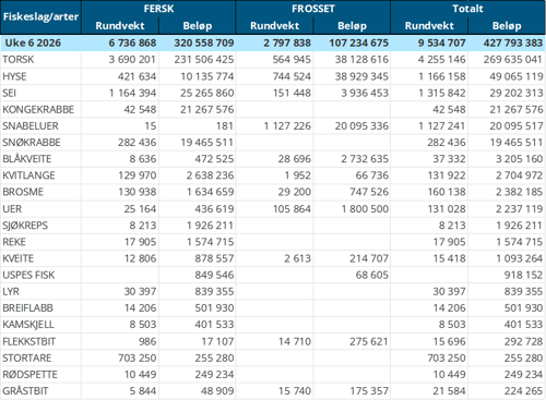 Omsetningen av fersklevert råstoff i uke 6 utgjør 321 millioner kroner, opp fra 278 millioner kroner uka før. Torsk, sei, kongekrabbe, snøkrabbe og hyse var størst i verdi med henholdsvis 232, 25, 21, 19 og 10 millioner kroner.