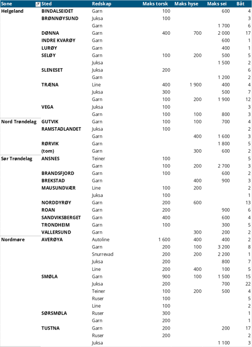 Fordelt på fangstområde ble det i uke 6 fanget mest i Varangerfjorden med 13 tonn, deretter 10 tonn i havområdet mellom Båtsfjord og Berlevåg, 7 tonn i Porsangerfjorden, 4 tonn i Tanafjorden, 3 tonn i Laksefjorden og 2,2 tonn utenfor Gamvik. Kvanta under 1 tonn i resterende fangstområder.