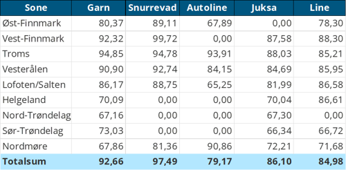 Omsetningen av fersk torsk i uke 6 havnet på 3.690 tonn til en verdi av 232 millioner kroner, sammenliknet med 2.860 tonn og 178 millioner kroner uka før. Samme uka i fjor var omsatt kvantum 1.320 tonn, til verdi 66 millioner kroner. Hittil i 2026 er det omsatt 12.000 tonn fersk torsk til verdi 753 millioner kroner, mot 7.650 tonn og 377 millioner kroner til samme tid i fjor. Kvantumsøkingen er kommet i Vest-Finnmark (opp fra 2.870 til 6.080 tonn) og Troms (fra 1.840 til 3.020 tonn). Det er økte kvanta tatt på garn, opp fra 4.360 til 7.390 tonn, snurrevad har økt sitt kvantum fra 1.640 til 2.600 tonn. Line og juksa har også økt sitt kvantum, til henholdsvis 880 og 270 tonn. Leveransene av fersk tråltorsk er ned fra 930 til 790 tonn. Prisutviklingen uttrykt i snittpriser framgår av tabell 2.