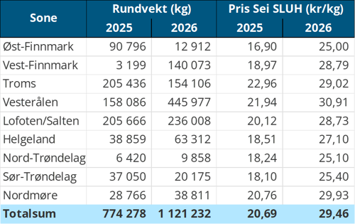 Omsetningen av fersk sei i uke 6 er 1.160 tonn til verdi 25 millioner kroner, litt opp fra forrige ukes 1.040 tonn / 23 millioner kroner. Hittil i år havner omsetningen av fersk sei på 6.790 tonn og 143 millioner kroner, mot 8.910 tonn og 137 millioner kroner samme periode i fjor. Det er størst kvantumsreduksjon i Vesterålen (ned fra 3.540 til 2.350 tonn), Troms (fra 2.900 til 1.760 tonn) og Lofoten/Salten (fra 1.150 til 830 tonn), mens det har vært økte seilandinger i Vest-Finnmark som er opp fra 390 til 1.030 tonn. I området Helgeland-Nordmøre er landingene av fersk sei ned fra 680 til 550 tonn. Fordelt på redskap er snurrevadkvantumet ned fra 3.800 tonn i fjor til 2.160 tonn i år, og garn er ned fra 4.550 til 3.920 tonn.