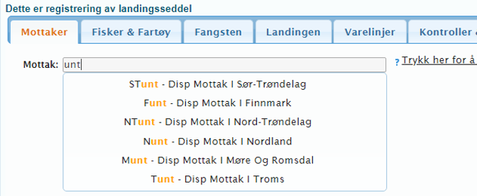 Vel inne hopper du fra fanekort til fanekort ved å klikke på fanen. På Mottaker skriver du FUNT dersom fangsten er landet i Finnmark, TUNT for Troms og NUNT for Nordland. Deretter klikker du på det aktuelle valget i nedfallsmenyen (FUNT illustrert som eksempel).