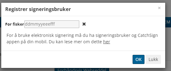 Til slutt må det registreres signeringsbruker, kun fiskers signeringsbruker er nødvendig å legge inn for landingssedler. Landingsseddel godkjennes av fisker i CatchSign appen.