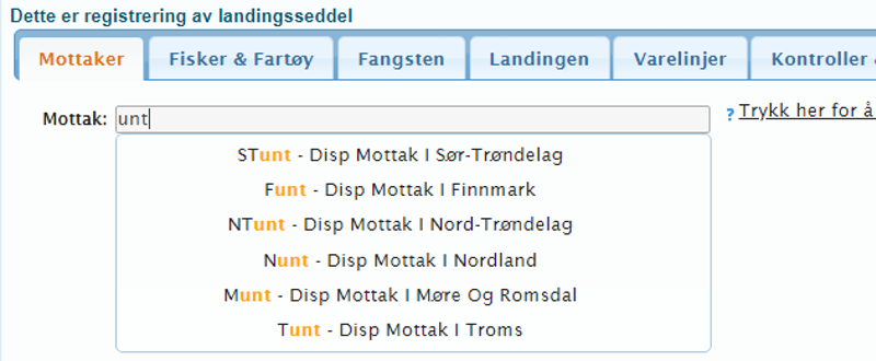 Vel inne hopper du fra fanekort til fanekort med «neste», eller ved å klikke på fanen. På Mottak skriver du «unt», og klikker på det riktige fylket for lagringsplassen.