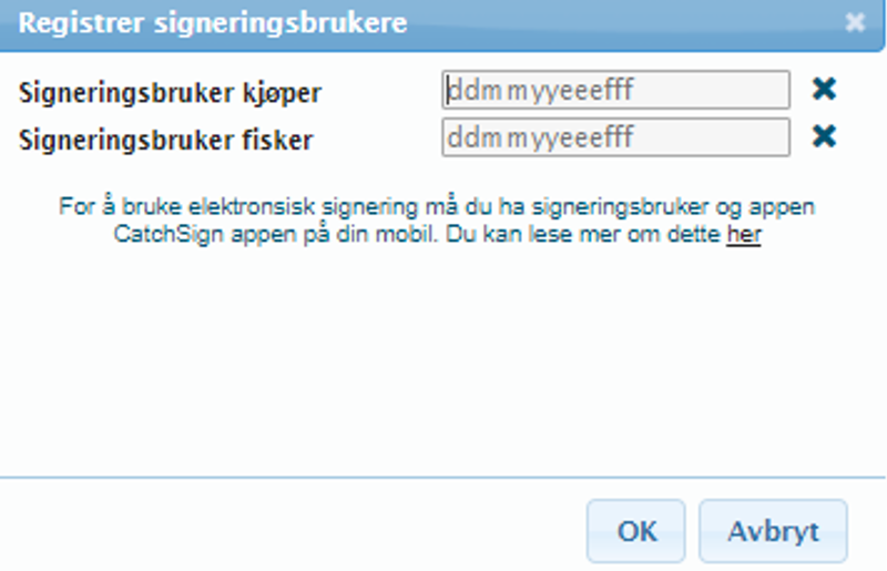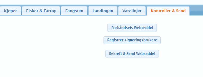 Til slutt må du registrere signeringsbrukere, både kjøper og fisker. Så kan du velge å se seddelen før du sender den. Uansett må du bekrefte og sende inn seddelen. Du vil få feilmeldinger med forklaringer om noe mangler eller ikke stemmer.