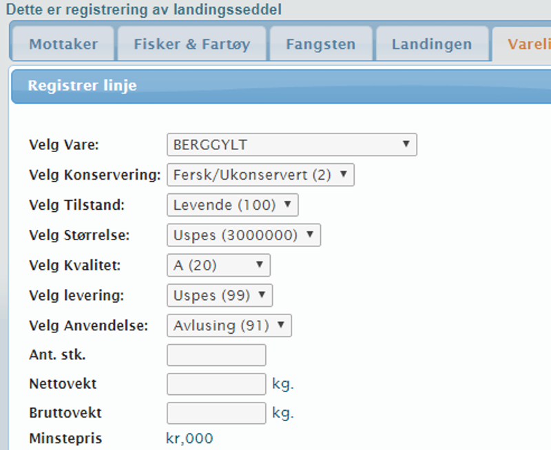 Fyll inn antall stykk, vekt vil omregnes etter offisiell faktor. Velg registrer linje.