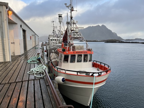 Thomas Sivertsen fra Sennesvik i Lofoten mottok statuetten som symboliserer Årets kvalitetsfisker 2022, her står han foran fiskebåten sin «T. Sivertsen». Foto: Norges Råfisklag