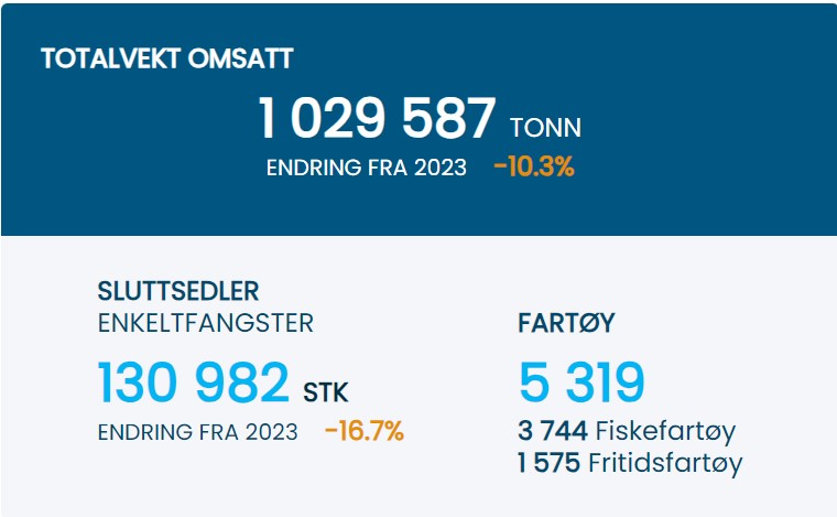 2024 er det ellevte året på rad med over 1 million tonn fisk, skalldyr og annen fangst levert og omsatt gjennom Norges Råfisklag. Mot 2023 er det en nedgang på 10,3 %.