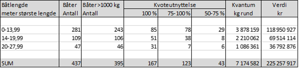 Deltakelsen i fisket, med fordeling på fartøystørrelse, og med tilhørende kvantum og verdi, framgår av følgende tabell: