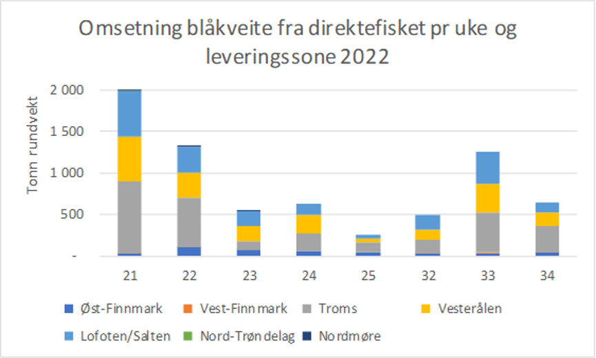 Tilsvarende tall fra Norges Råfisklags omsetning er 7.306 tonn fram til fisket ble stoppet 26. august, til verdi 229 millioner kroner, som også inkluderer fangst tatt som bifangst utenom direktefisket. Det innebærer at 300 tonn er omsatt gjennom andre salgslag. I 2021 nådde kvantumet 7.462 tonn til verdi 178 millioner kroner omsatt gjennom Råfisklaget fram til direktefisket ble stoppet. Fisket hadde da mye lengre varighet, og ble stoppet fra og med 16. september 2021.